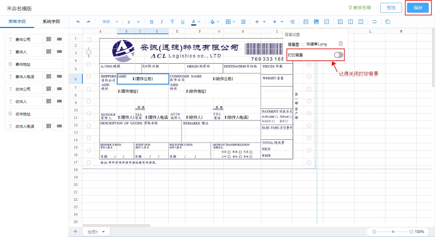 • 设计完成后,将【打印背景】属性关闭,并保存打印模板。