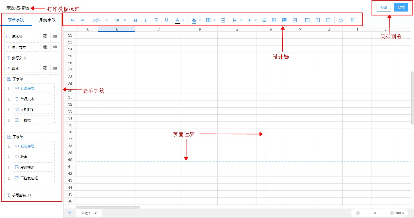 • 边界线根据纸张大小确定,当边界线在某行/某列单元格中间时,建议调整单元格宽/高,将单元格完全设计在边界线内,以免单元格内容未打印完整。
