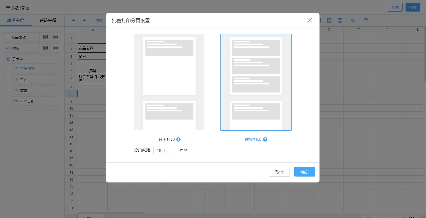 • 批量打印分页设置用于批量打印场景,当页面空间允许时,一页内打印多条数据;
