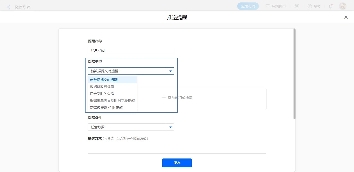 推送提醒被提醒人可以设置成表单内的成员控件或部门控件,且可以设置重复周期,比如员工生日提醒一年提醒一次,被提醒人可以是行政部或人事部等。