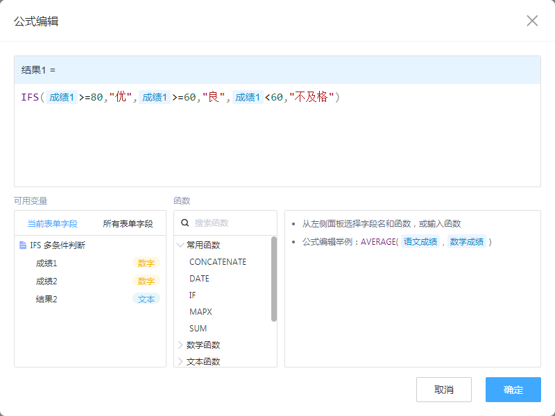 用于判断多个条件是否成立,成立则返回指定结果,不成立返回空。
