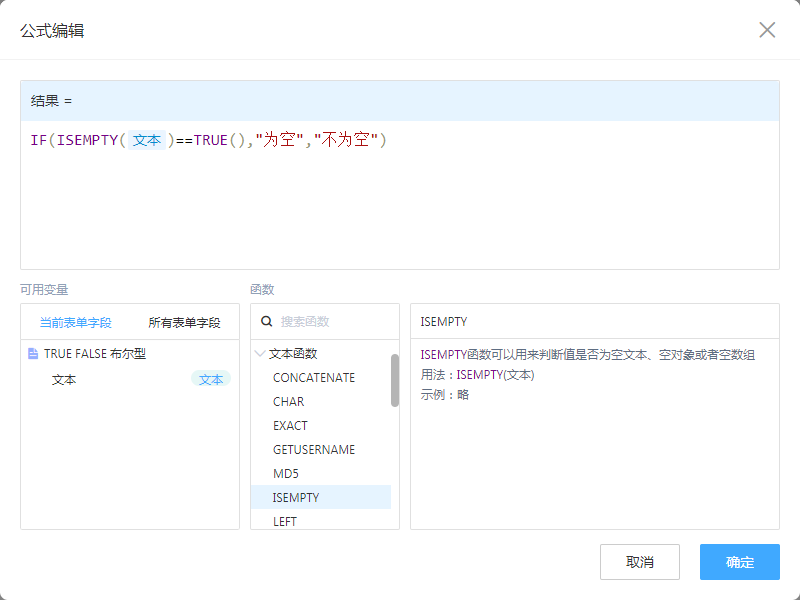 • 判断“文本”是否为空,条件成立值为TRUE(),判断结果等于TRUE(),则返回“为空”,否则返回“不为空”。