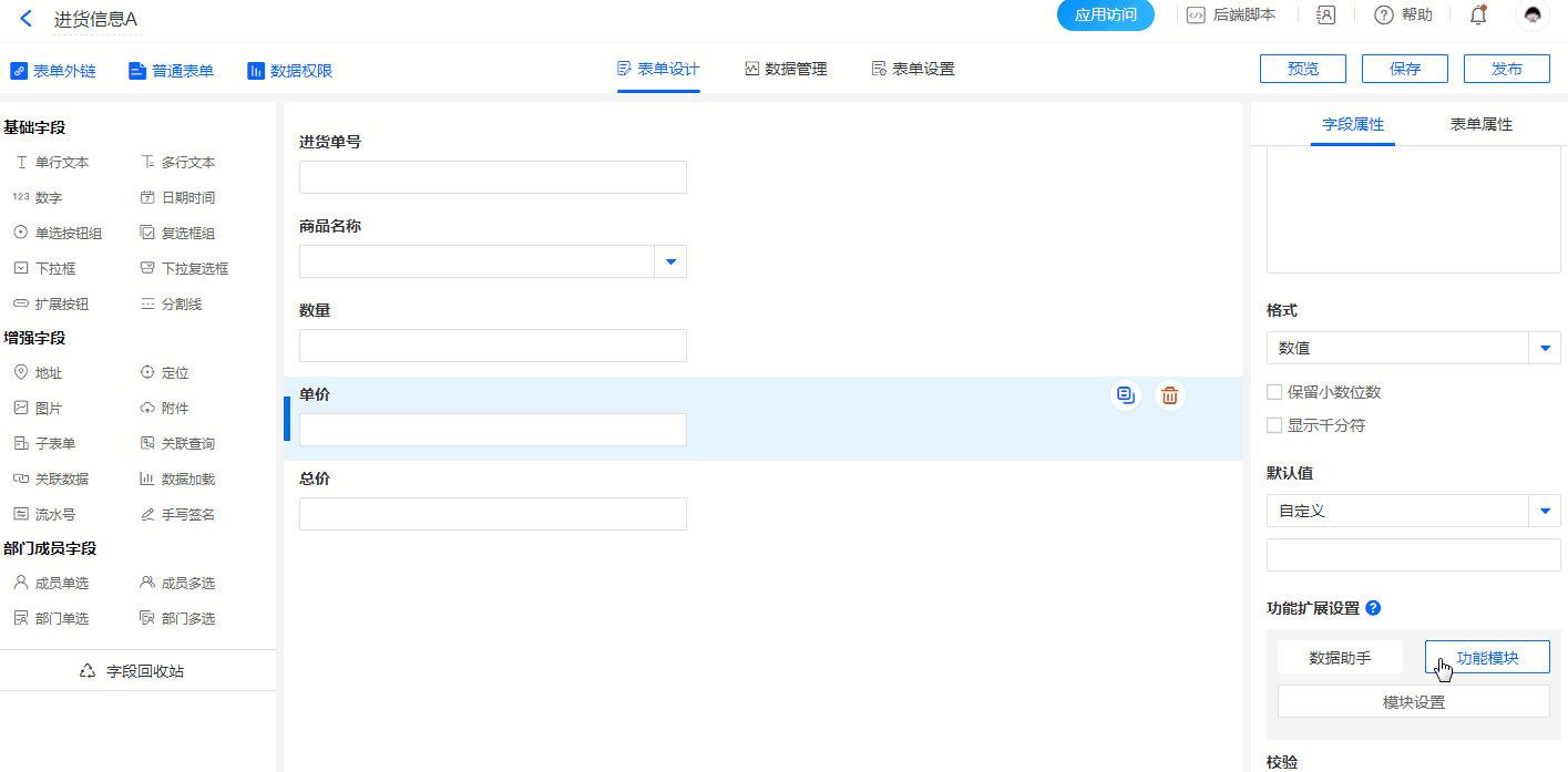 如:A表为商品信息表,B表为进货表,B表的进货商品名称设置了“关联其他表单数据”,那么A表中的商品名称数据就直接作为B表进货商品名称的选项了。
