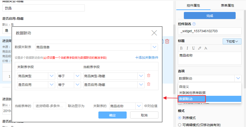 步骤: 【点击目标控件】——【控件属性-选项】——【数据联动】——【设置联动条件】——【确定】