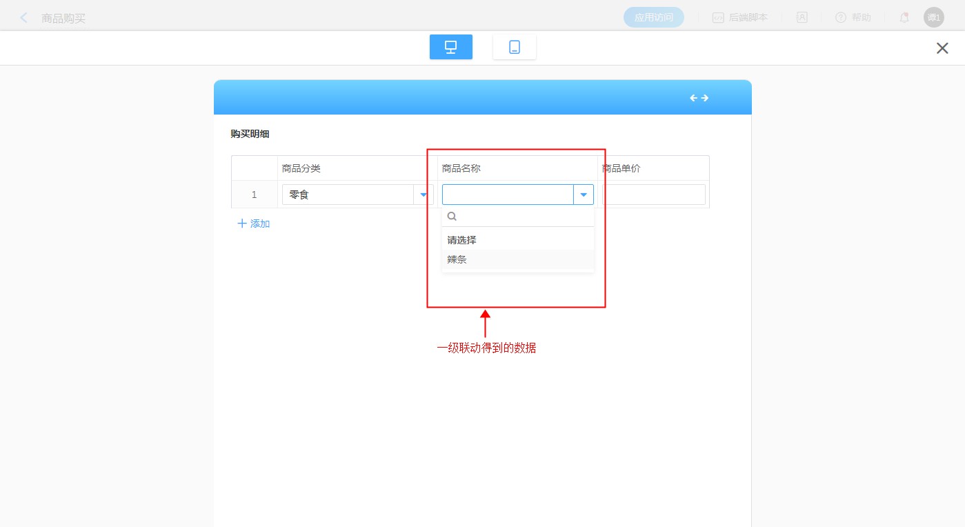 • 3、一级联动:【子表单】控件属性“字段”添加1个【下拉框】字段,标题为:商品名称,数据联动到表单【商品信息】里的"商品名称"。
