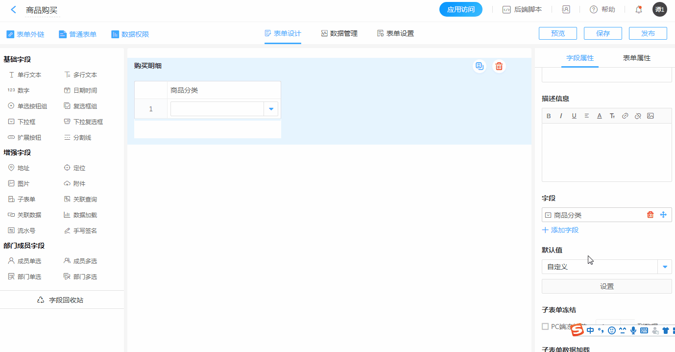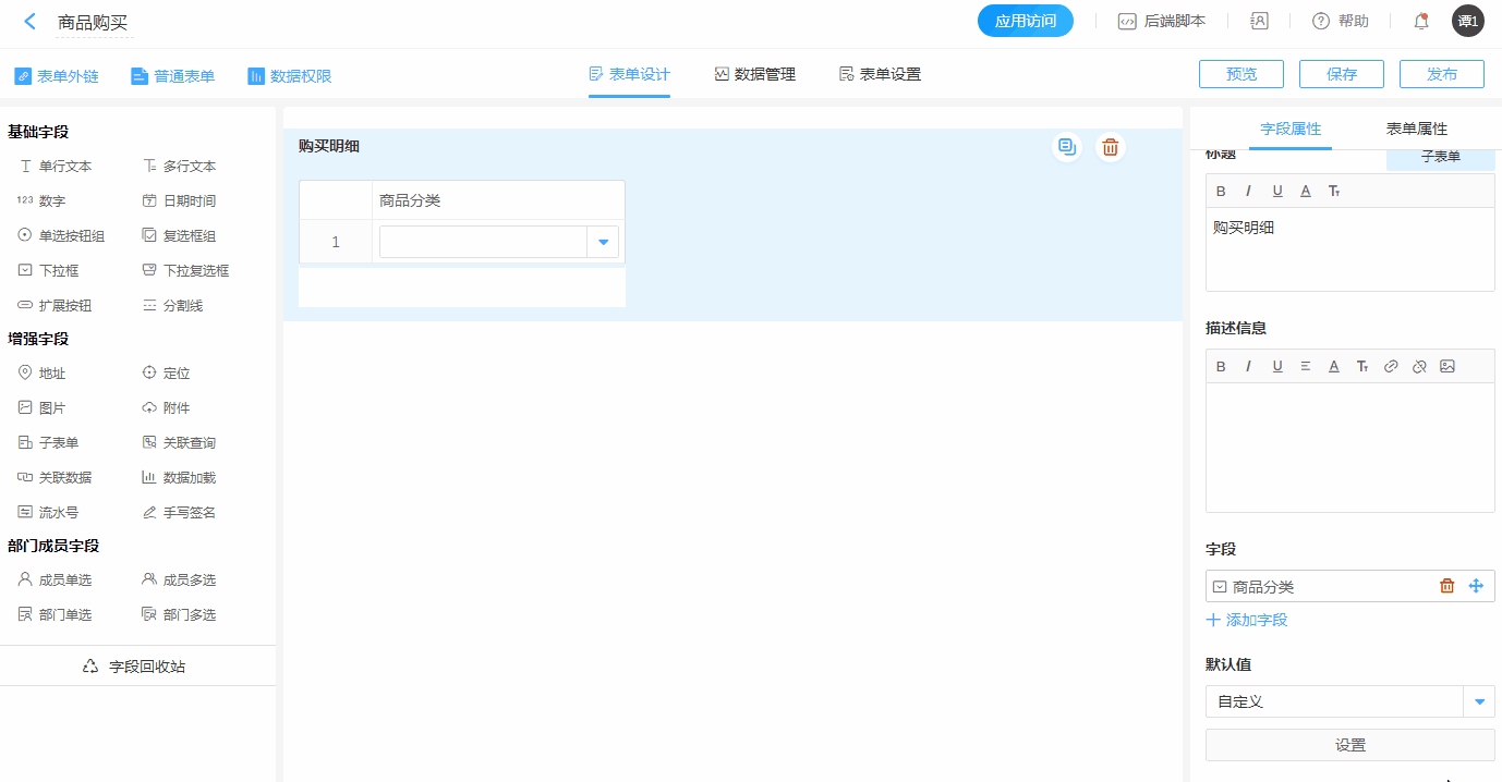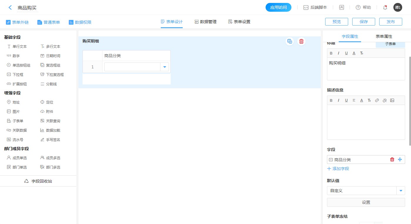 • 2、【子表单】控件属性“字段”添加1个【下拉框】字段,标题为:商品分类,数据关联到表单【商品信息】里的"商品分类"。