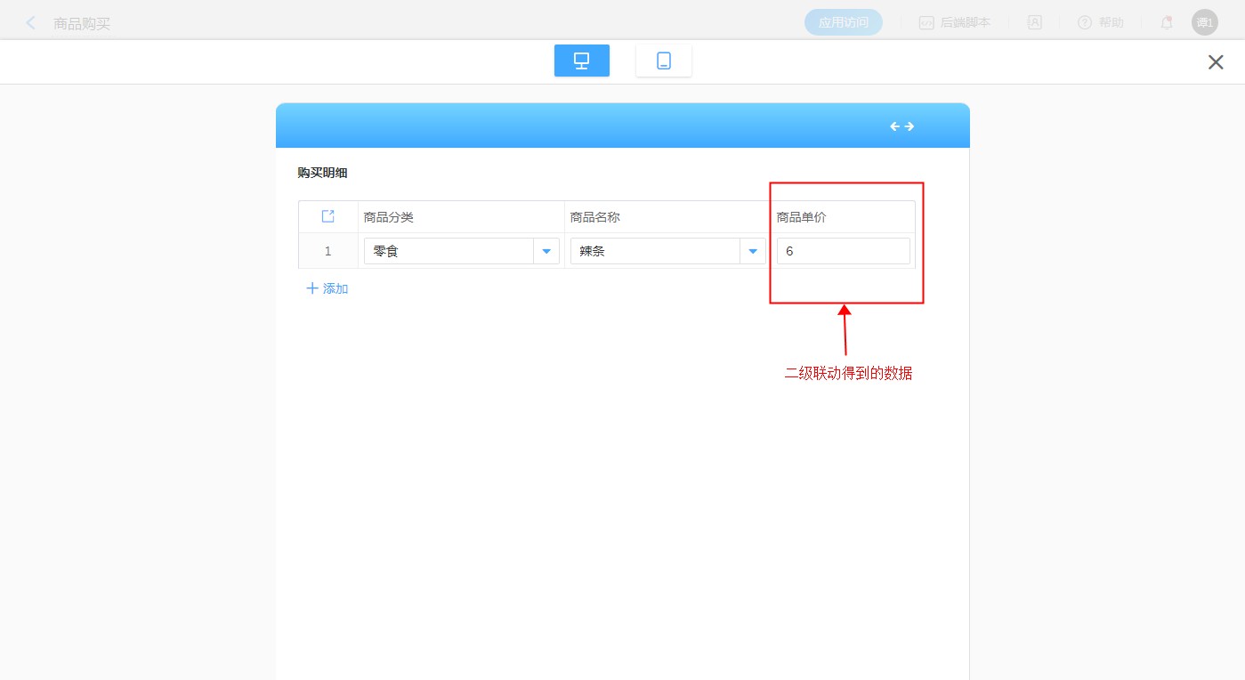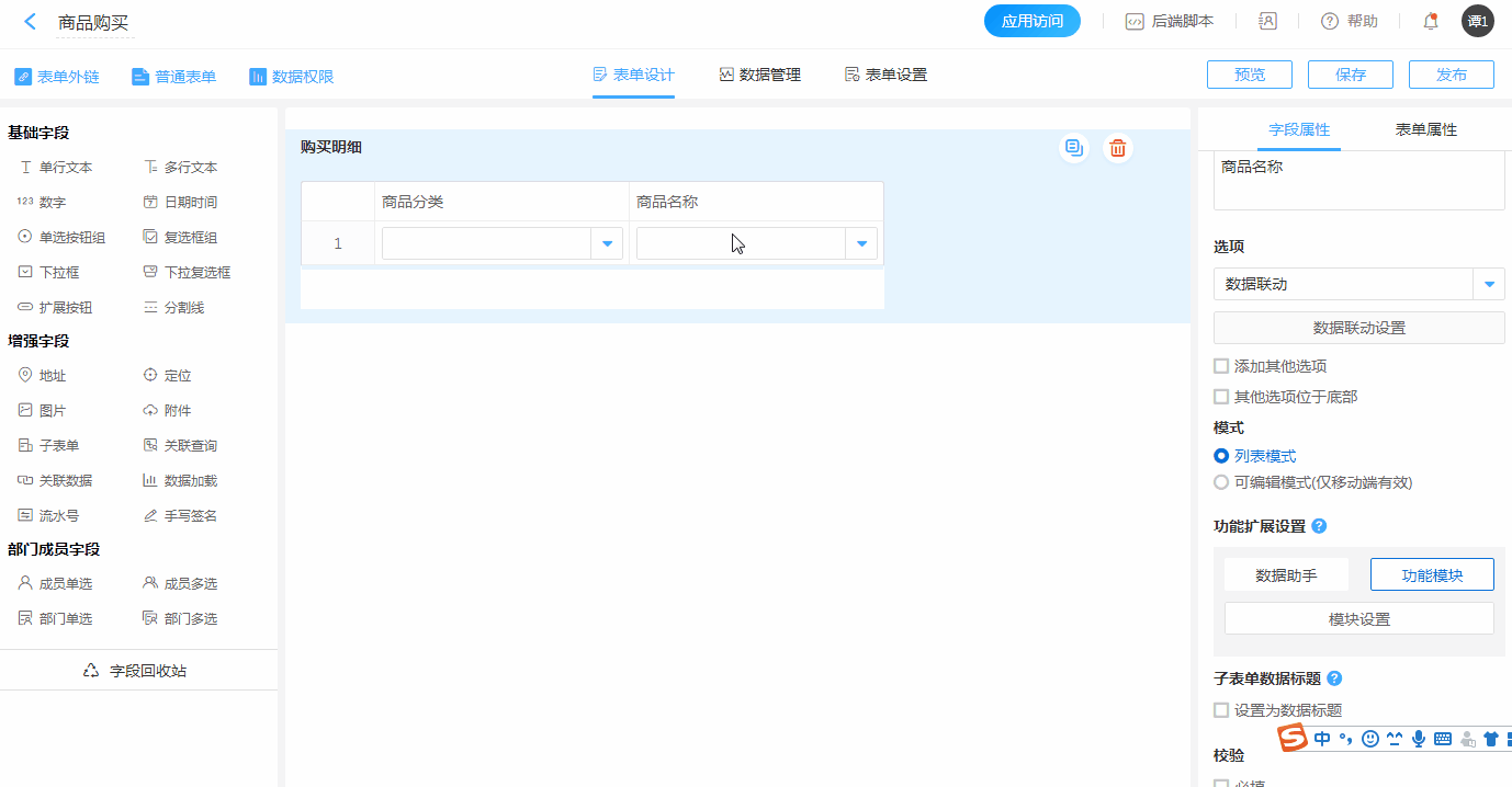 • 4、二级联动:【子表单】控件属性“字段”添加1个【数字】字段,标题为:商品单价,数据联动到表单【商品信息】里的"商品单价"。