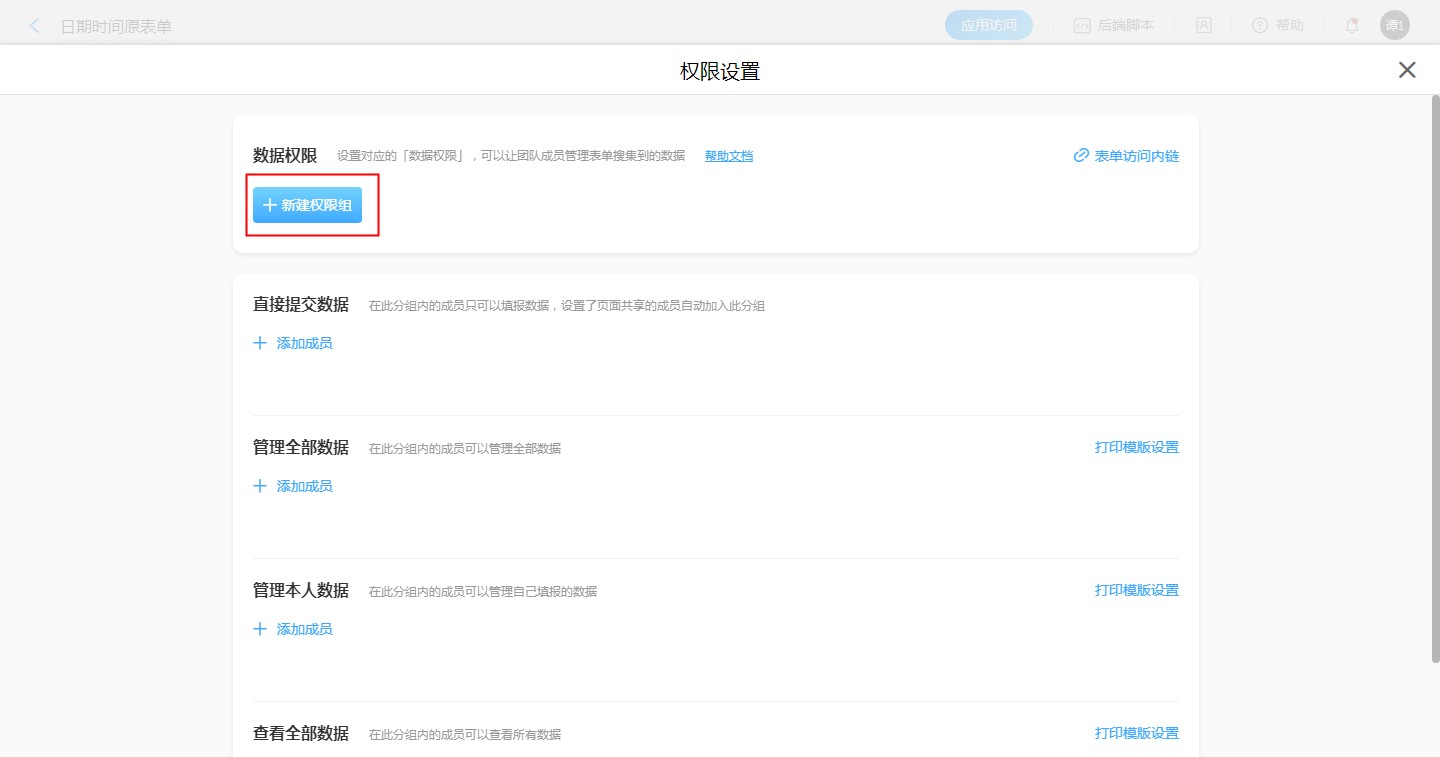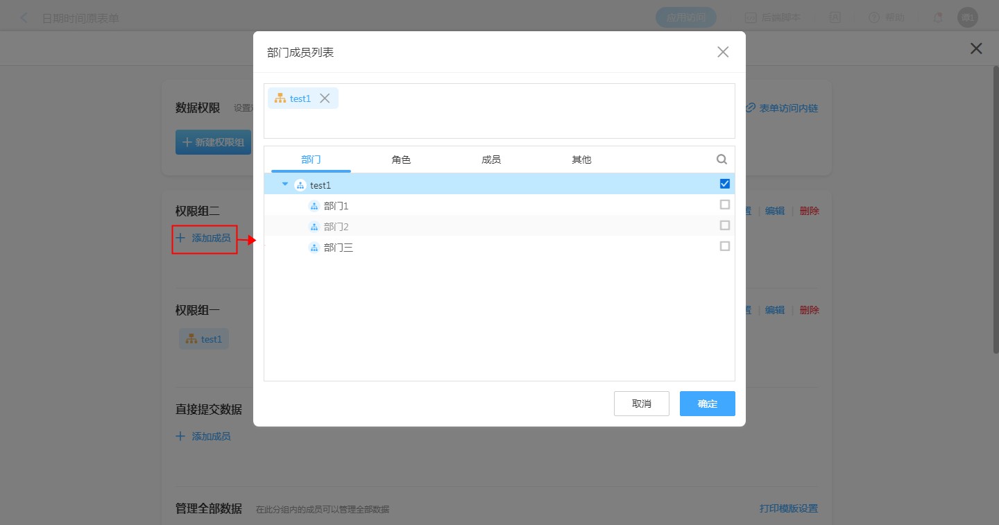 1、给成员设置权限:【表单设计】-【数据权限】——【选择成员】
