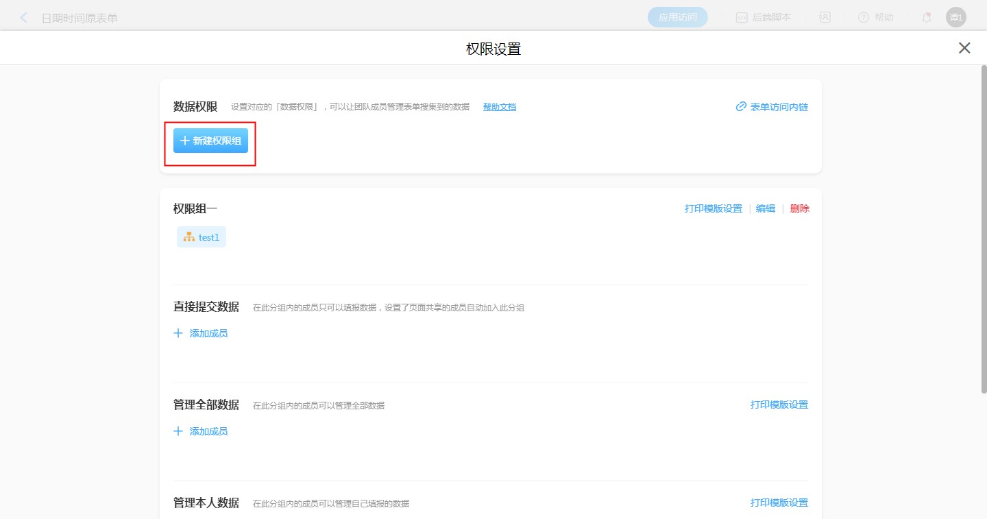 1、【新建权限组一】——【配置权限组一】——【权限组一添加成员】