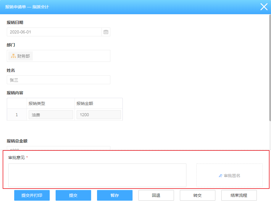 提交、回退或结束流程时填写的审批意见,会记录并显示出填写人,节点名称,提交时间,意见内容。暂存时如果填写了审批意见,则暂存的审批意见其他人不可见。