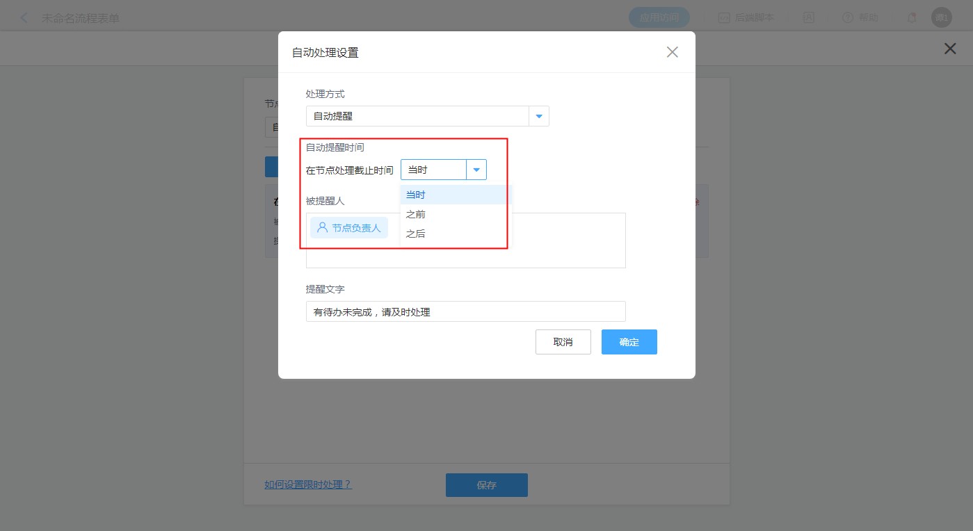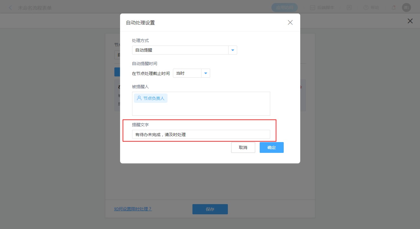 如果限时处理选择的是「自动提醒」,可以自定义设置提醒文字。