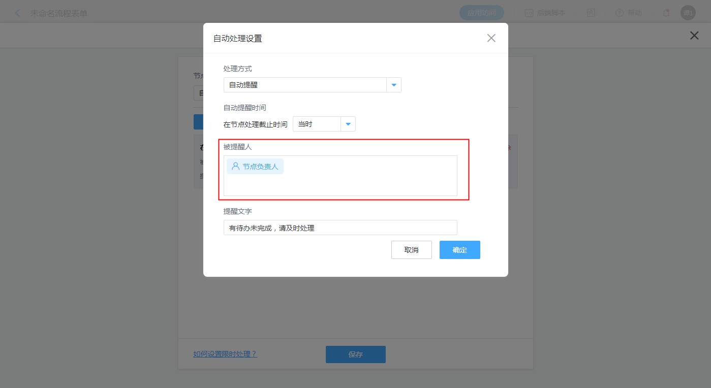 如果限时处理选择的是「自动提醒」,则需要设置被提醒人。