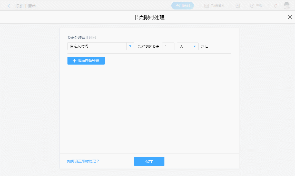 3. 流程节点自动处理时长不得超过1年,如果触发时间超过1年,则不创建限时处理。