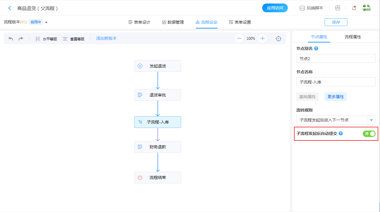通过设置父流程到子流程的「流转规则」可以规定父子流程间同步或异步的流转关系。