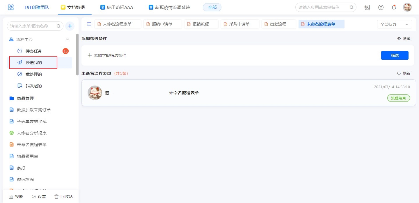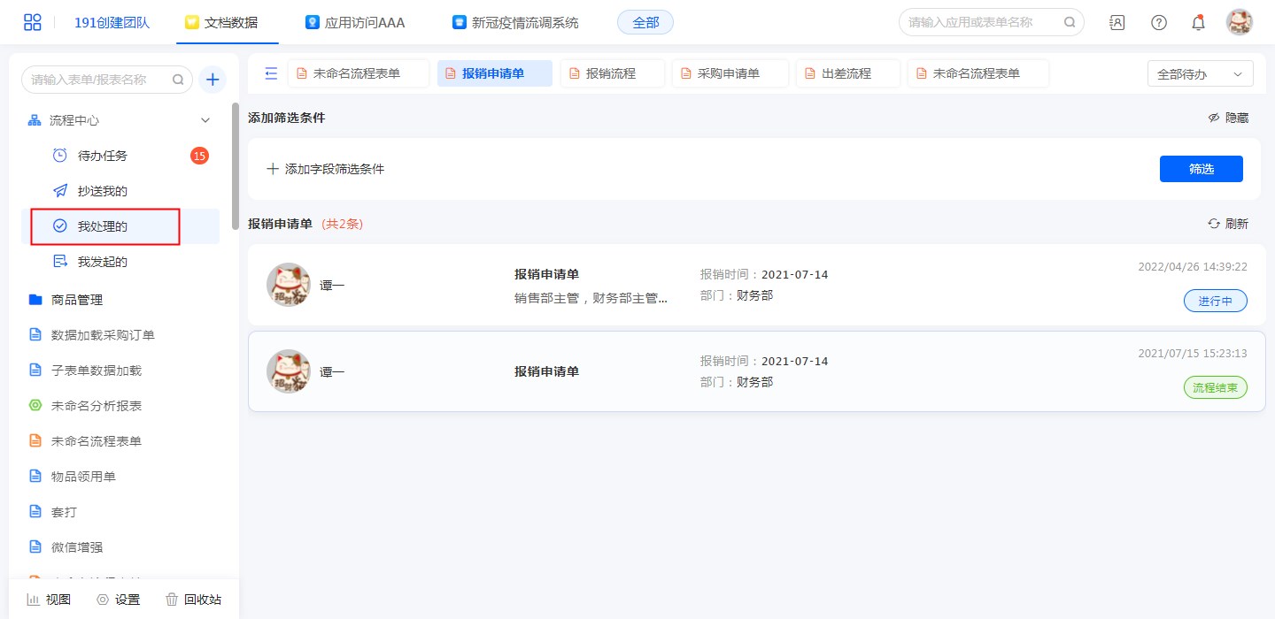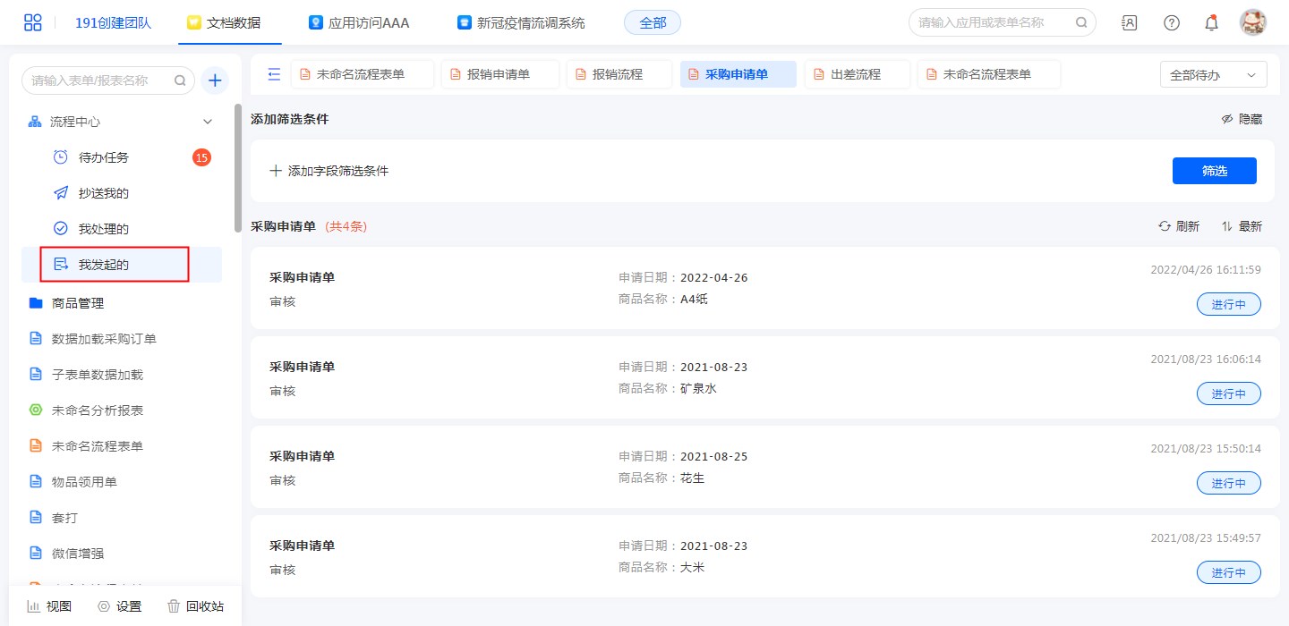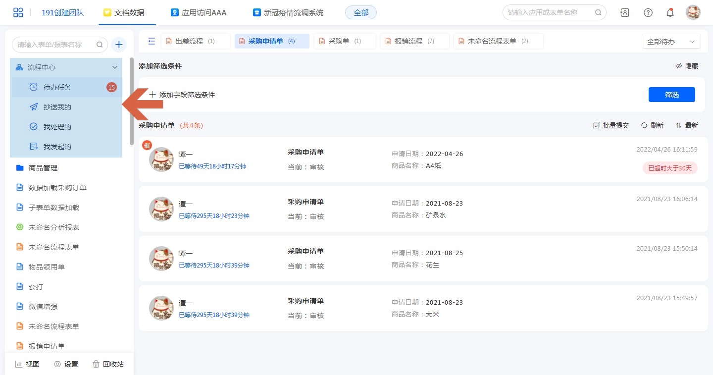 进入应用访问页面,如果当前应用有已启用的流程表单,则在应用左上会出现流程中心,根据其功能不同,分为待办任务、我的发起、我处理的和抄送我的,若有当前用户需要处理的任务,还会显示具体数量;点击进入后可查看相应分类下的任务列表。