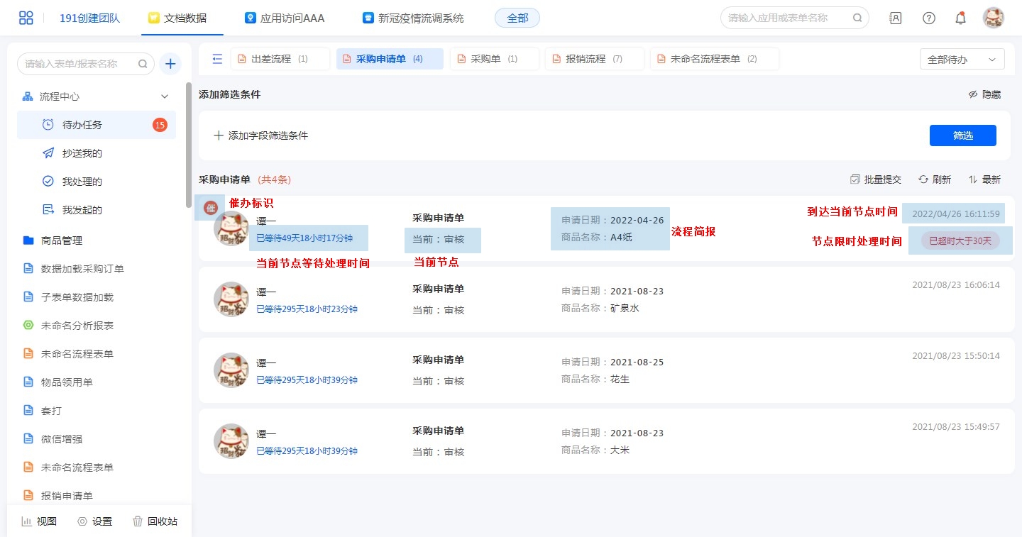 待办任务中显示的都是需要当前用户进行处理的流程,系统会根据表单名称对待办任务进行分类;