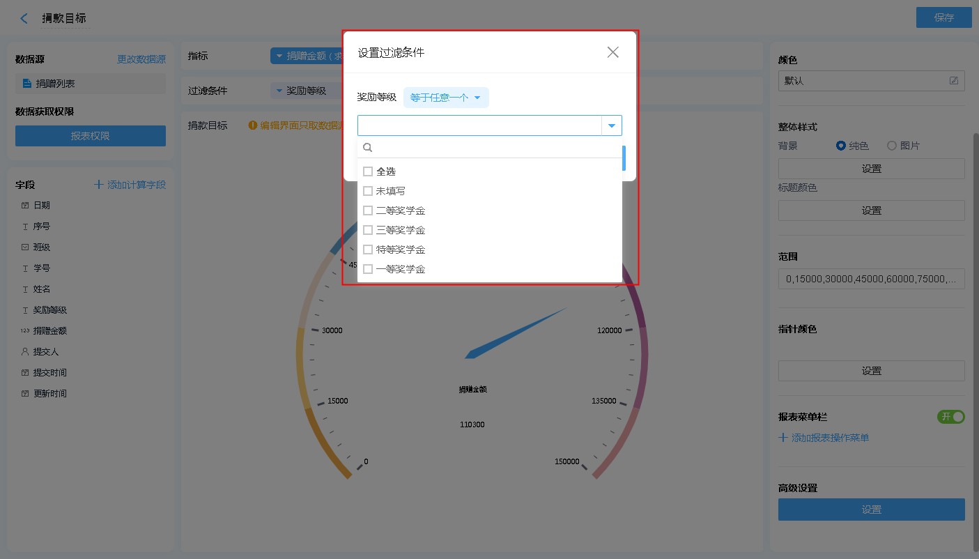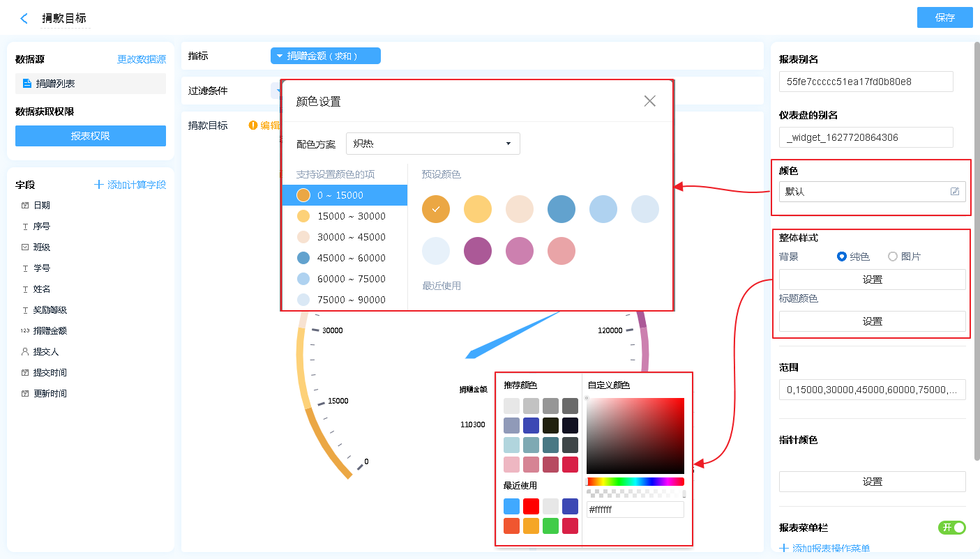 仪表盘支持样式自定义,可自定义的包括:样式、颜色