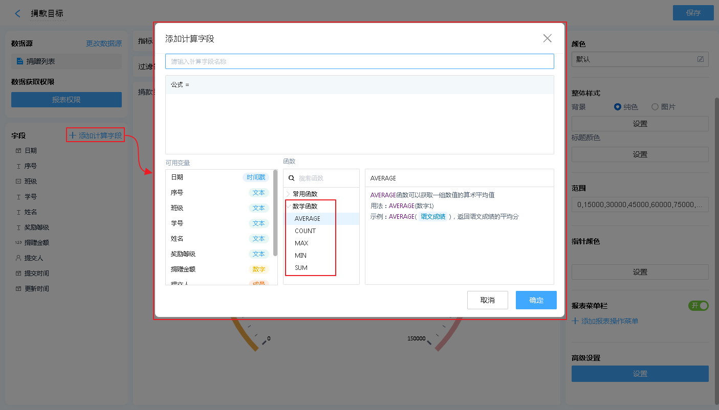 也可以通过增加公式字段,对报表中显示的内容进行简单的计算处理【支持绝大多数数学函数及+-*/四则运算】。