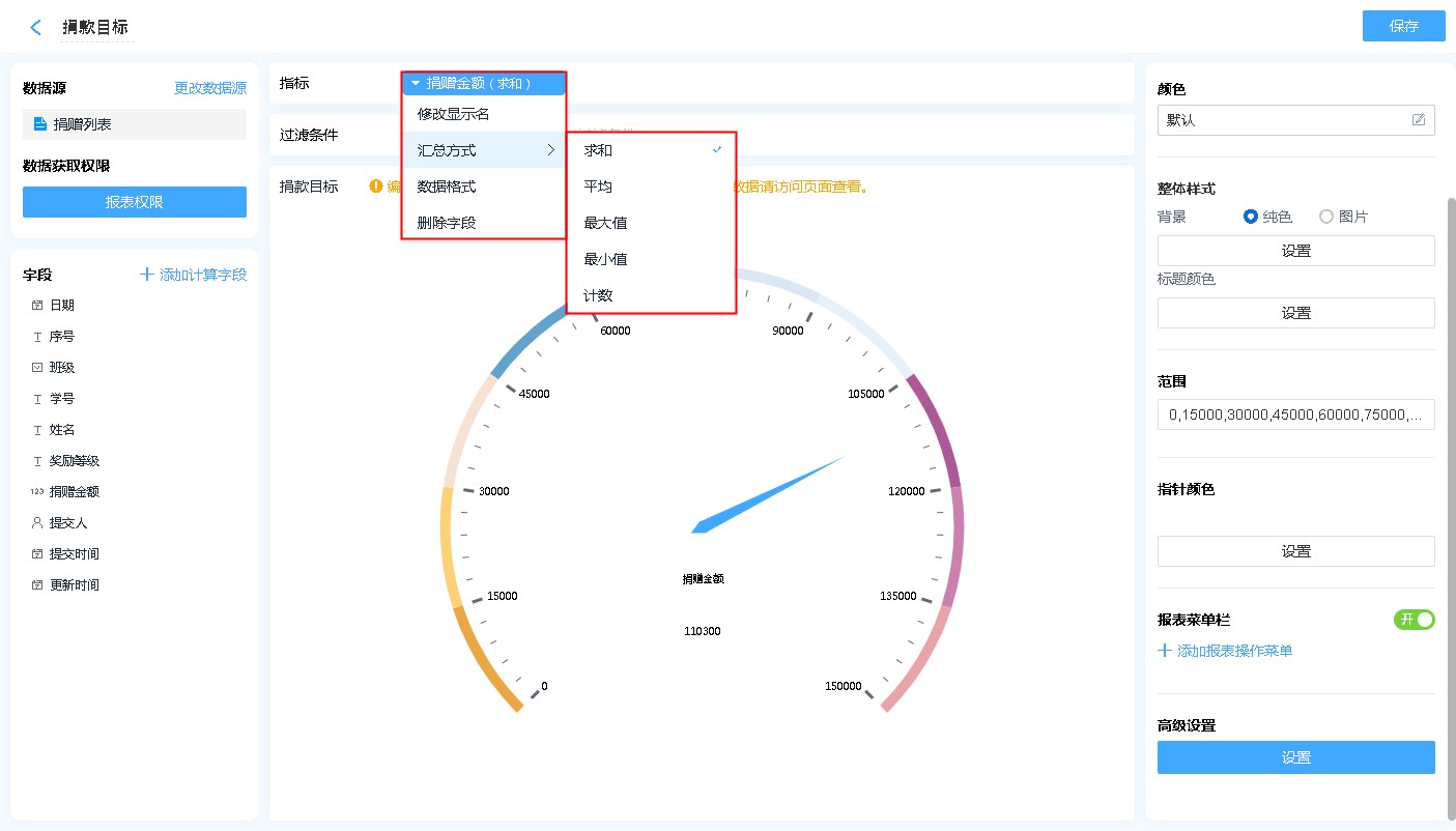 指标可以从数据源表单字段中选择,也可以是自己添加的「计算字段」。