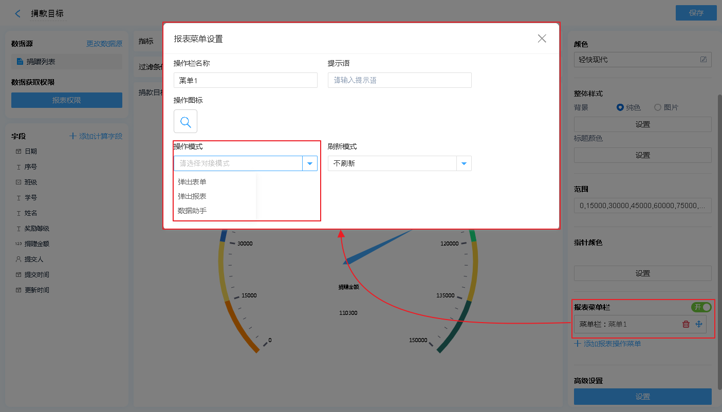 报表菜单 支持 弹出表单、弹出报表、数据助手