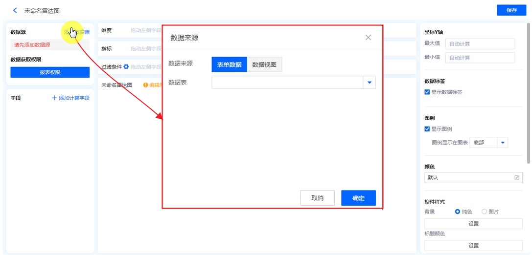 数据源就是指当前雷达图表的数据来源,可以是表单、数据视图。