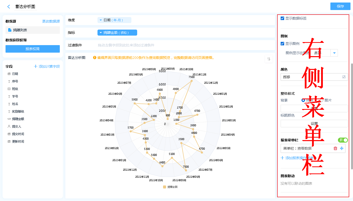 雷达图的右侧菜单主要用来对雷达图进行各种设置。
