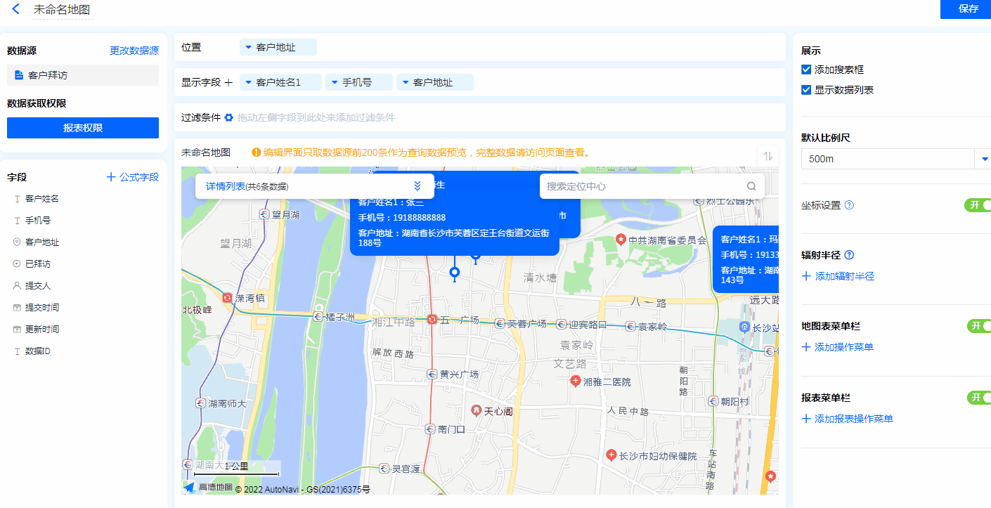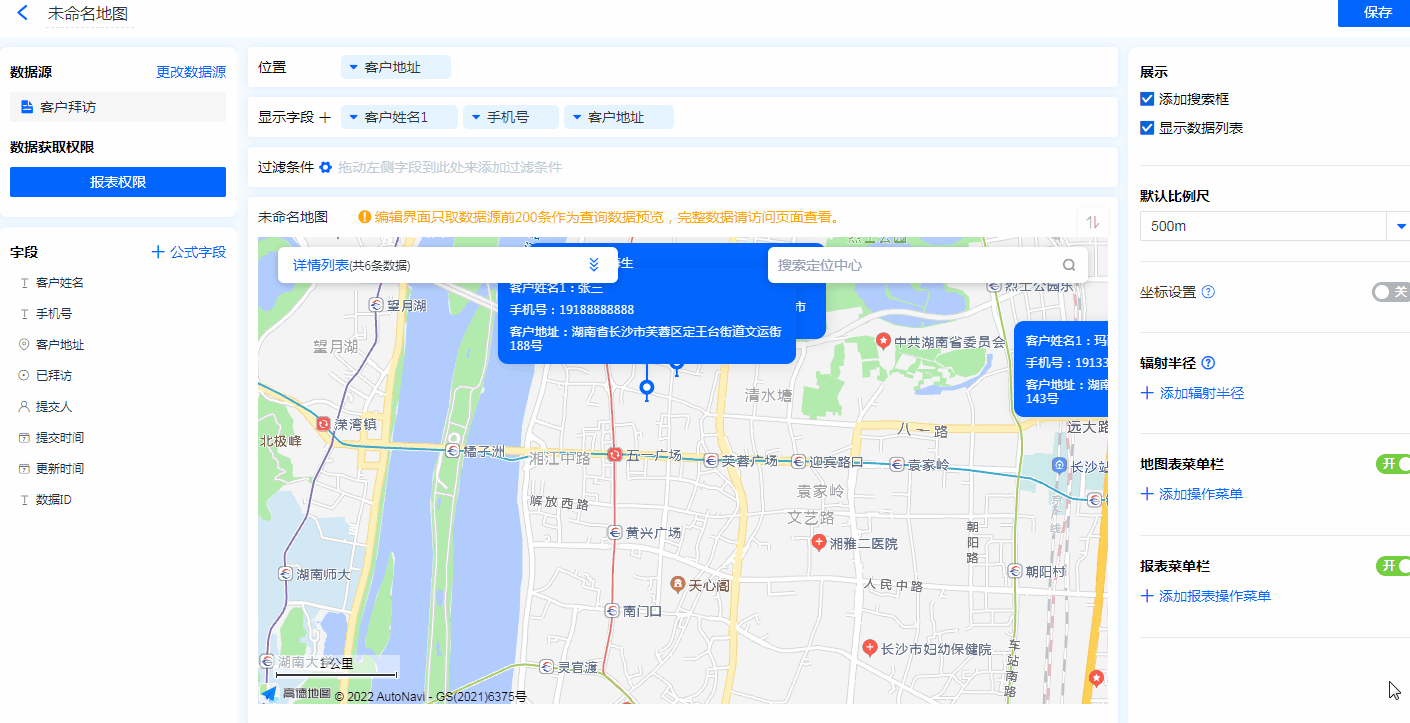 - 地图标识功能:显示字段勾选地图标识功能后,地图的位置标记处会显示该字段信息。