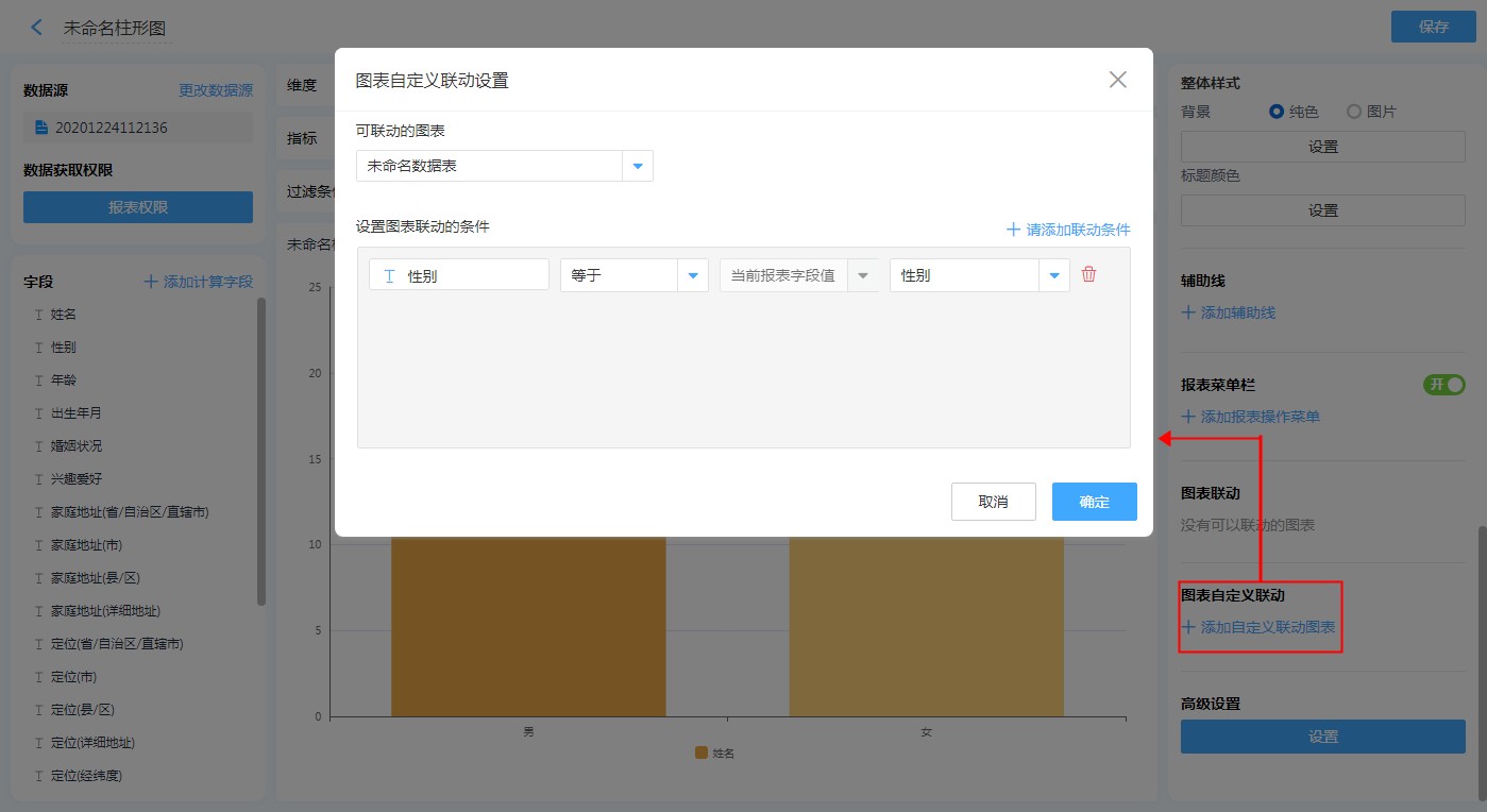 设置步骤:【报表】——【图表编辑页面】——【图表自定义联动】——【设置联动条件】。