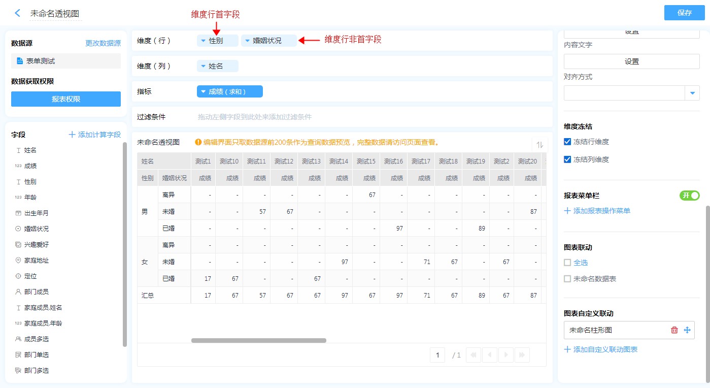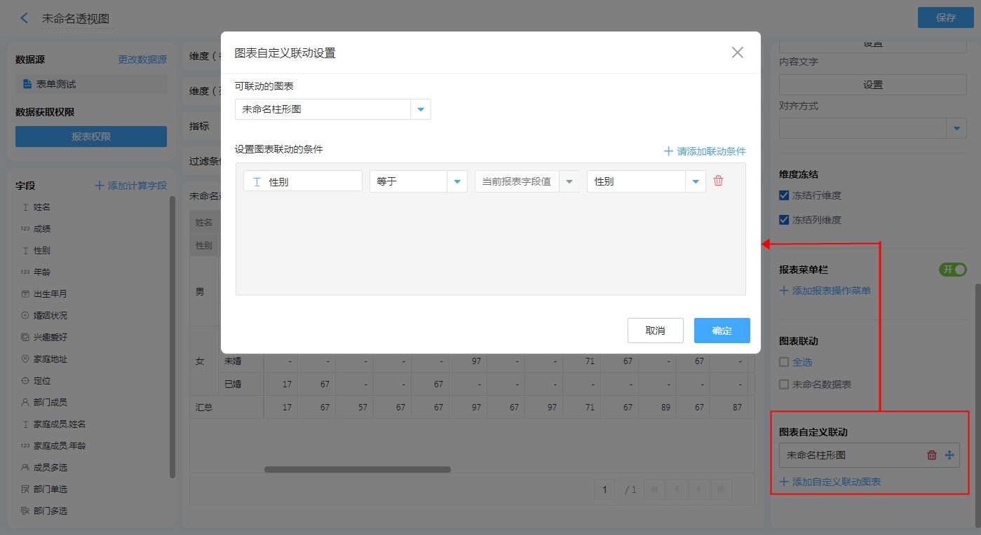 操作步骤:【报表】——【透视图编辑页面】——【图表自定义联动】——【设置联动条件[联动条件为透视图维度非首字段]】
