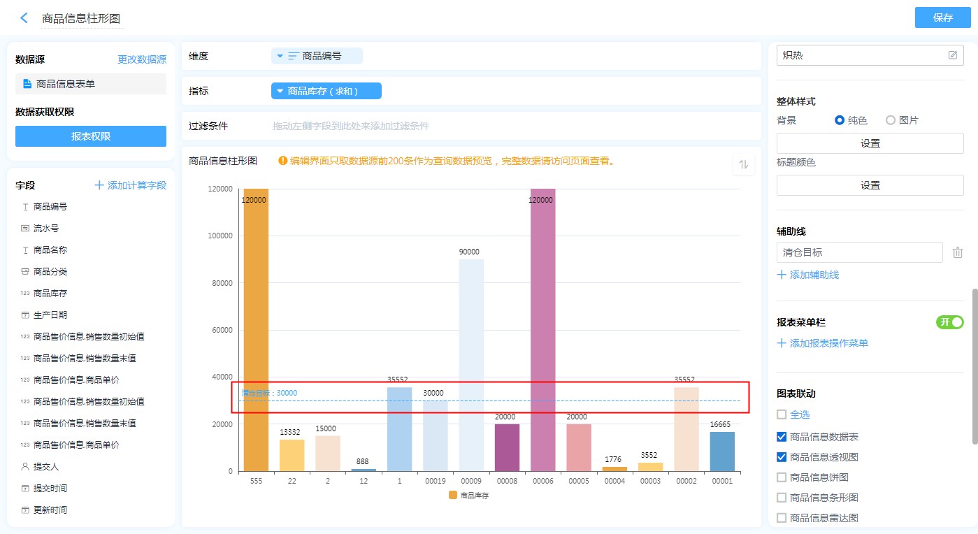 如,商品清仓时,每个种类的商品库存目标是30000件,将辅助线设置为固定值设置为30000,可以清楚的知道哪些种类的商品库存大于30000,需要大力清仓。