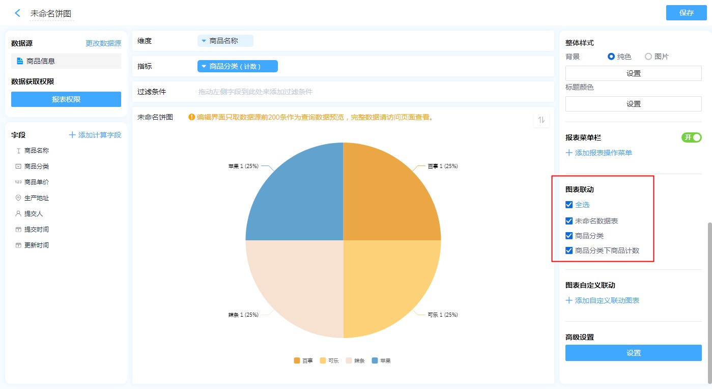 设置步骤:【新报表】——【图表编辑页面】——【图表联动】,勾选需要联动的图表。