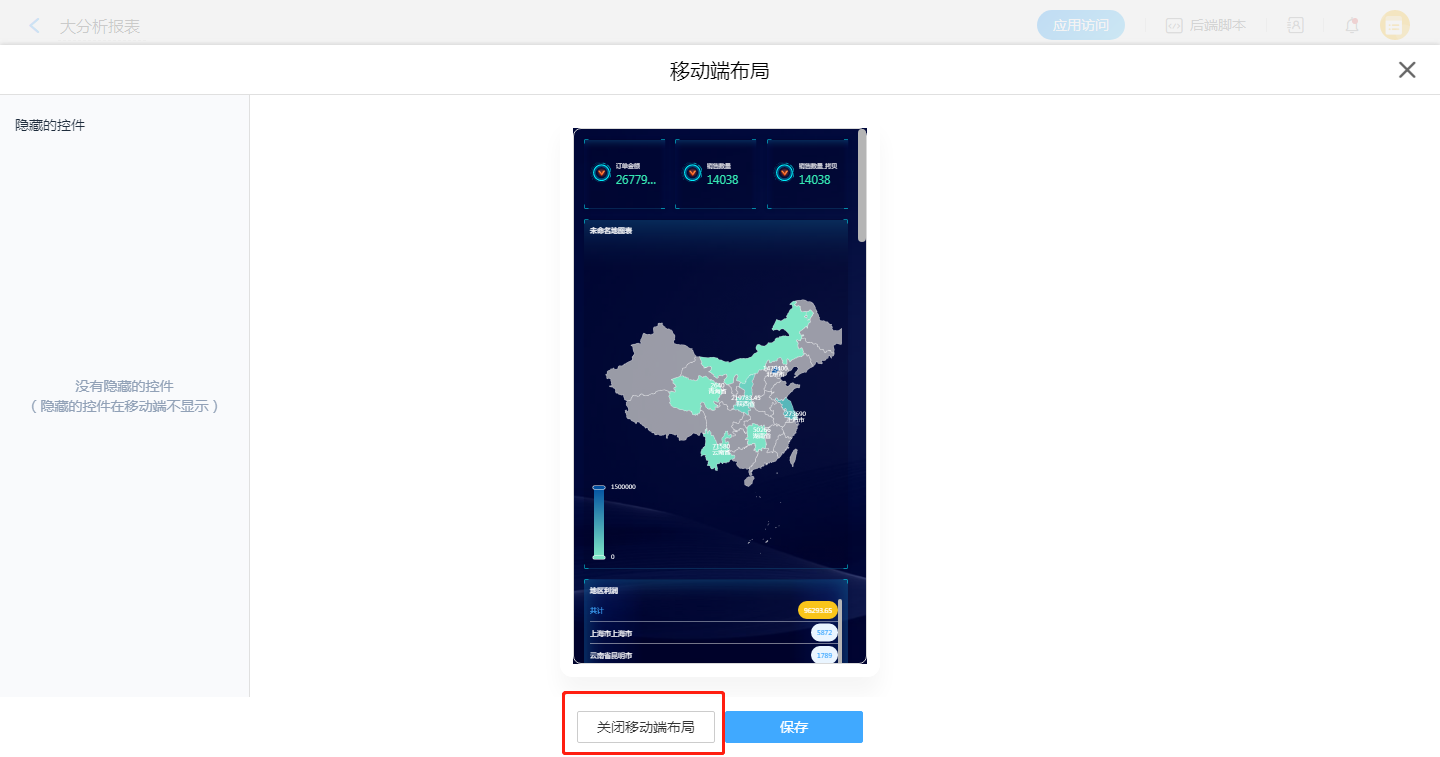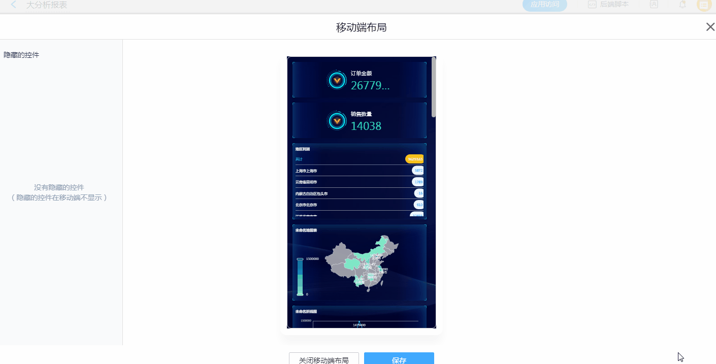 • 在移动布局中,可以自定义各个控件在移动端的展示位置、是否展示。用户可以根据需要,在此处优化报表移动端的排版。