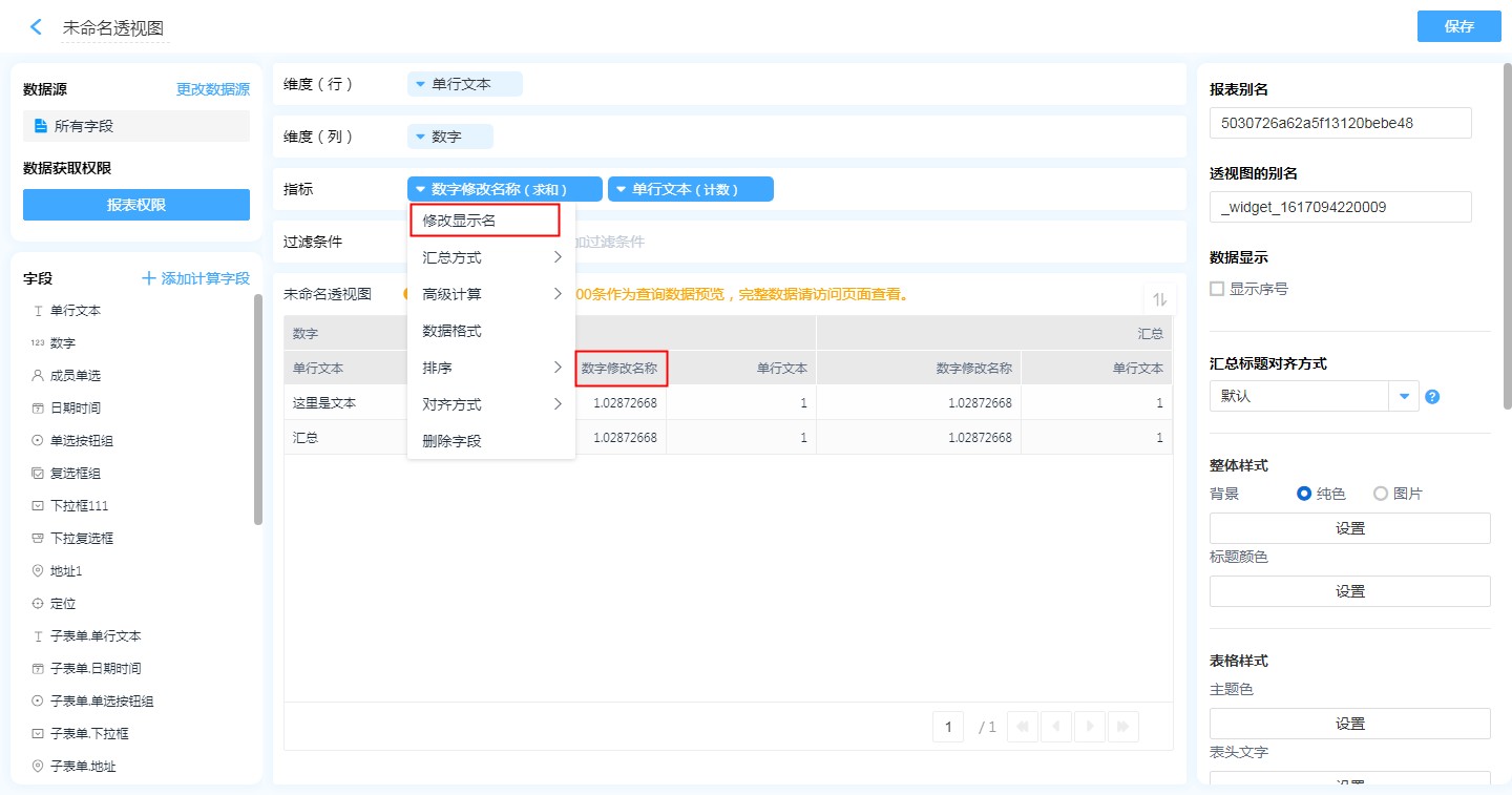 数字字段汇总方式支持:求和、平均、最大值、最小值、计数、去重计数。