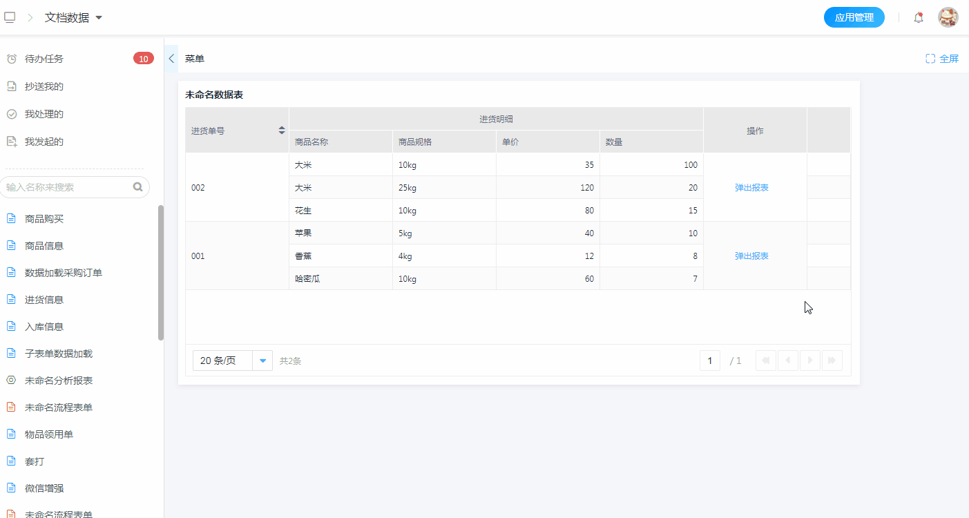 弹出报表可以用于查询数据,在单条数据的操作栏点击按钮即可弹出对应的报表,并可传入筛选条件进行查询数据。