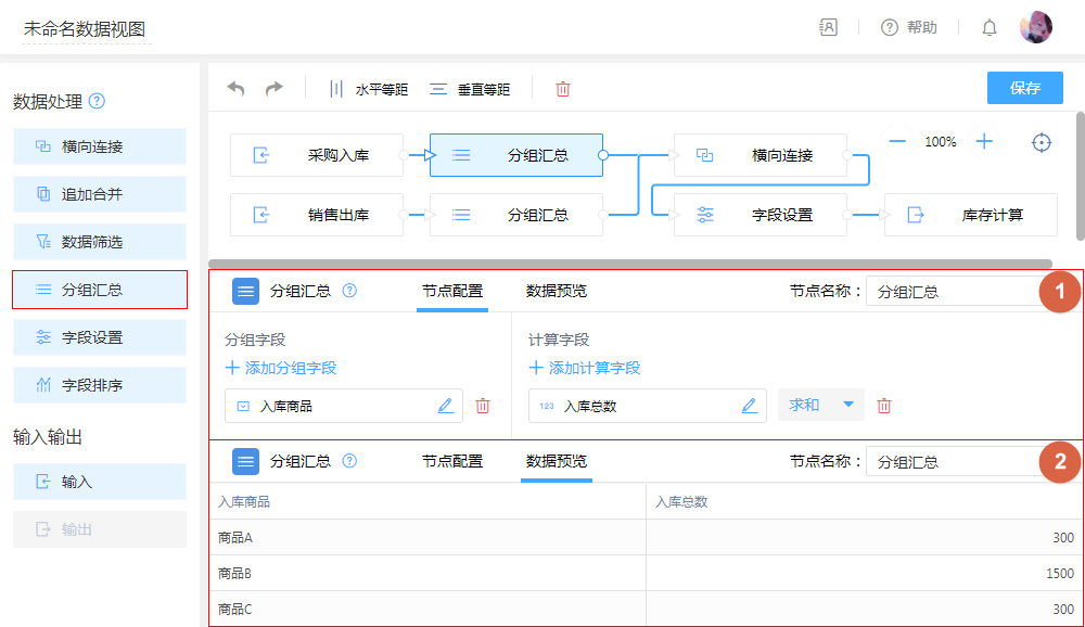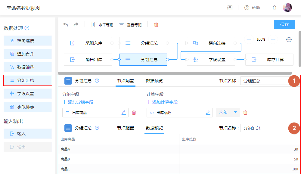 2. 配置:分组汇总,对出入数据按“商品”相同的进行汇总出入“总数”。