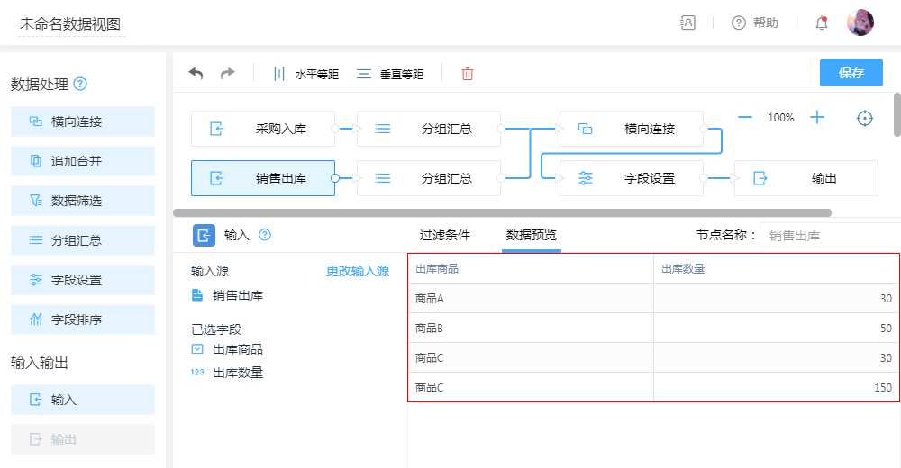 3. 配置:横向连接,以“商品”为连接字段,把出入两表数据进行横向拼接,把“入库”与“出库”数据横向拼接为一张表。