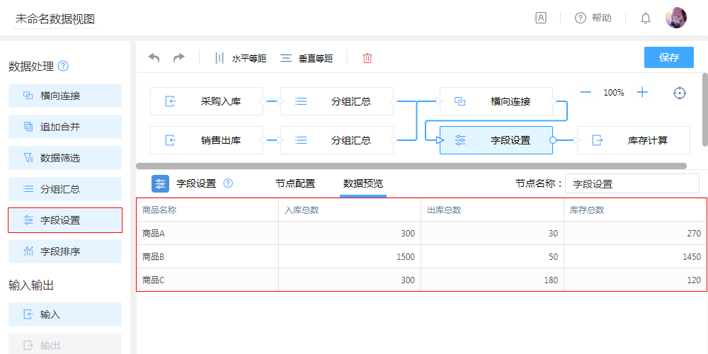 4. 配置:字段设置,配置计算字段,即可通过“入库”总数与“出库”总数,计算出最新剩余库存。