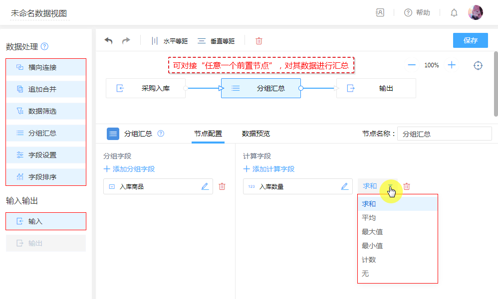 根据“分组字段”相同内容的数据进行分组,汇总“计算字段”的数值,进行求和、平均、取最大值或最小值、计数、去重计数,等汇总处理。