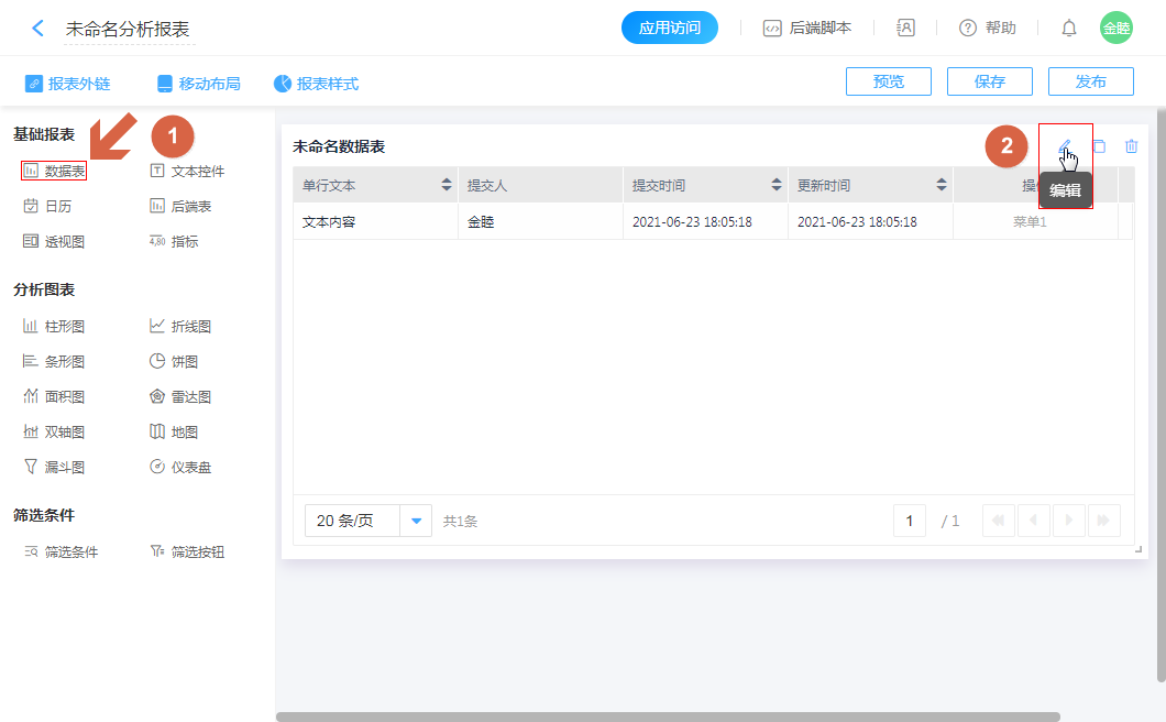②、报表菜单:所有“基础报表”与“分析图标”均可配置使用,触发后会把选定的报表数据传入“数据助手”执行功能。