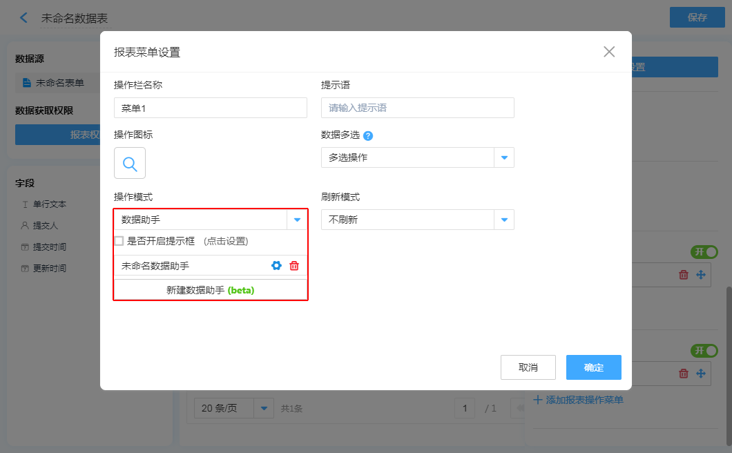 ①、数据表菜单:只在“数据表”中可配置,触发后会把当前这一行数据传入“数据助手”执行功能。